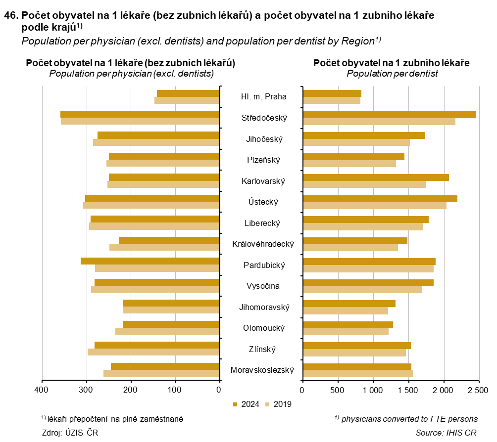 Graf 46 Počet obyvatel na 1 lékaře (bez zubních lékařů) a počet obyvatel na 1 zubního lékaře podle krajů
