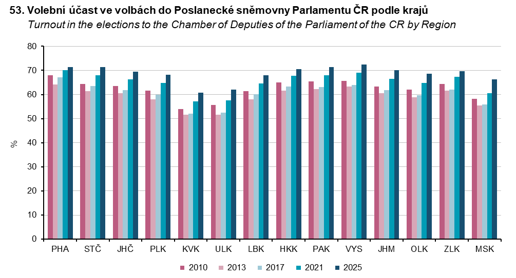 Graf 53 Volební účast ve volbách do Poslanecké sněmovny Parlamentu ČR podle krajů