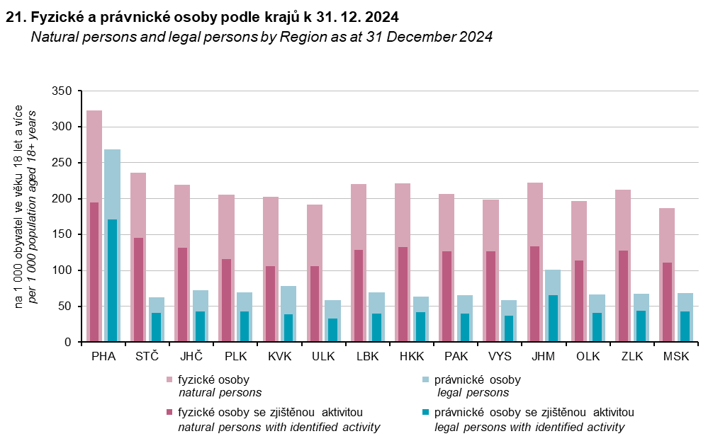 Graf 21 Fyzické a právnické osoby podle krajů k 31. 12. 2024