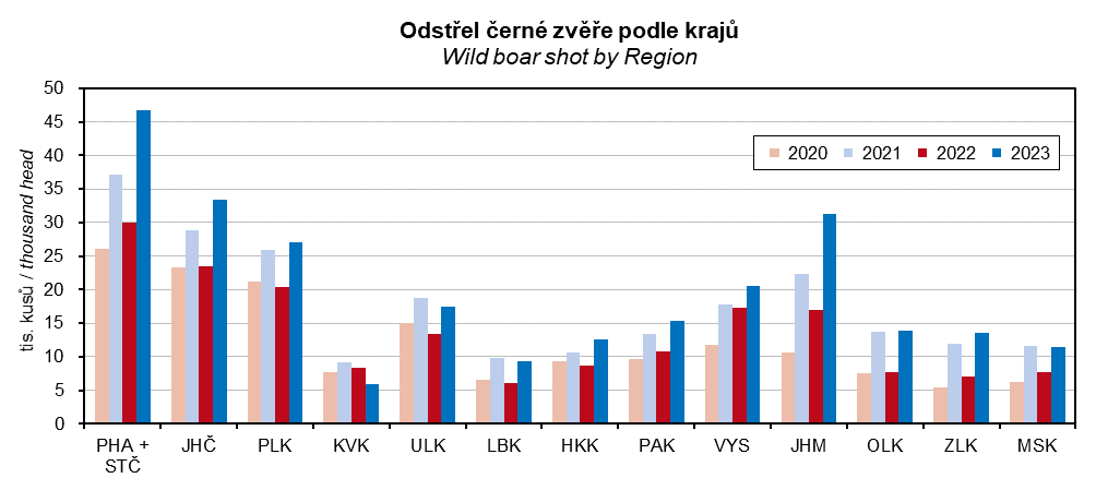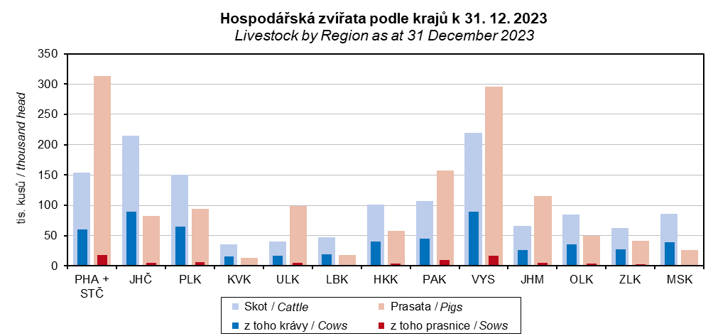 Graf 26 Hospodářská zvířata podle krajů k 31. 12. 2023