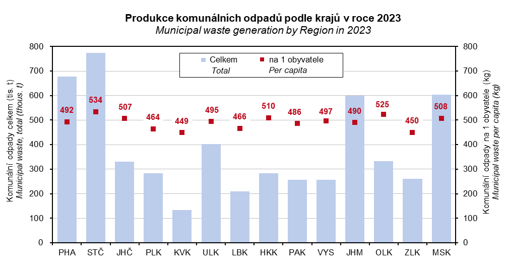 Graf 6 Produkce komunálních odpadů podle krajů v roce 2023