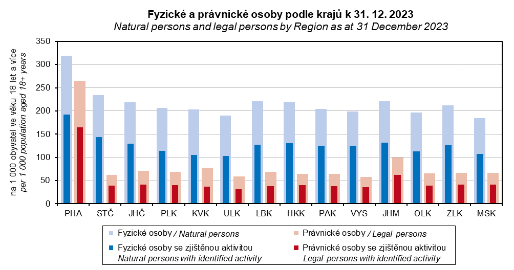 Graf 22 Fyzické a právnické osoby podle krajů k 31. 12. 2023
