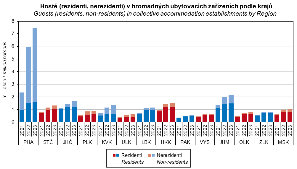 Graf 38 Hosté (rezidenti, nerezidenti) v hromadných ubytovacích zařízeních podle krajů
