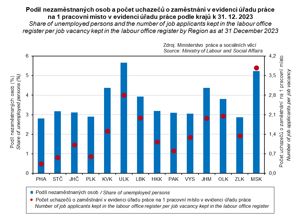 Graf 21 Podíl nezaměstnaných osob a počet uchazečů o zaměstnání v evidenci úřadu práce na 1 pracovní místo v evidenci úřadu práce podle krajů k 31. 12. 2023