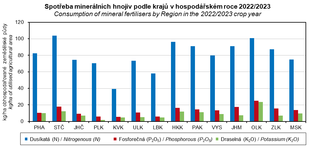 Graf 27 Spotřeba minerálních hnojiv podle krajů v hospodářském roce 2022/2023