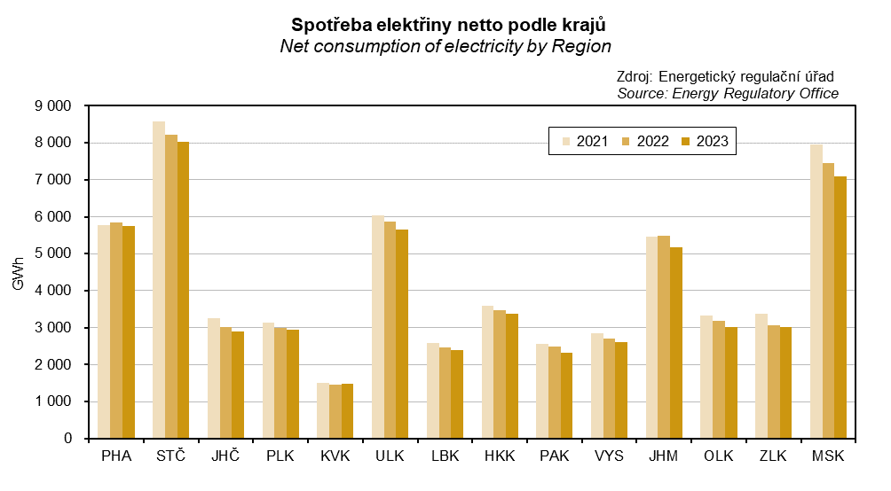 Graf 32 Spotřeba elektřiny netto podle krajů