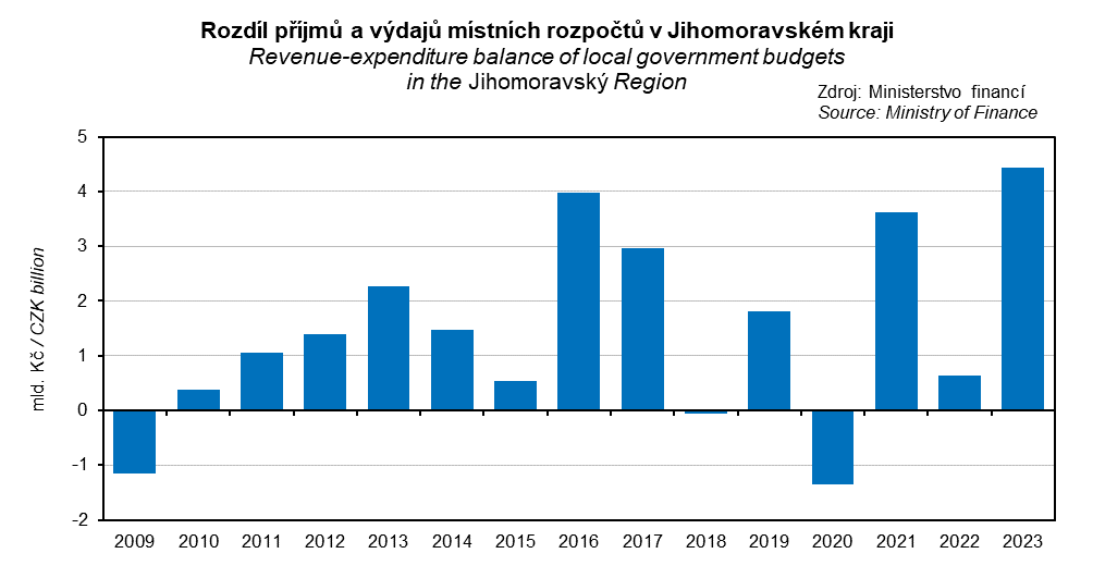 Graf 17 Rozdíl příjmů a výdajů místních rozpočtů v Jihomoravském kraji