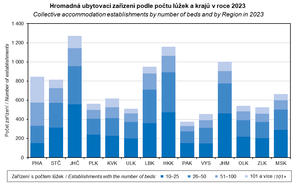 Graf 37 Hromadná ubytovací zařízení podle počtu lůžek a krajů v roce 2023
