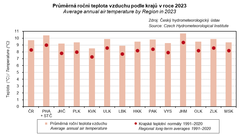 Graf 3 Průměrná roční teplota vzduchu podle krajů v roce 2023