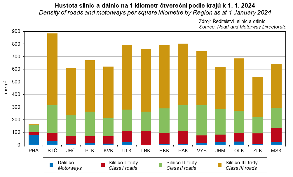 Graf 40 Hustota silnic a dálnic na 1 kilometr čtvereční podle krajů k 1. 1. 2024