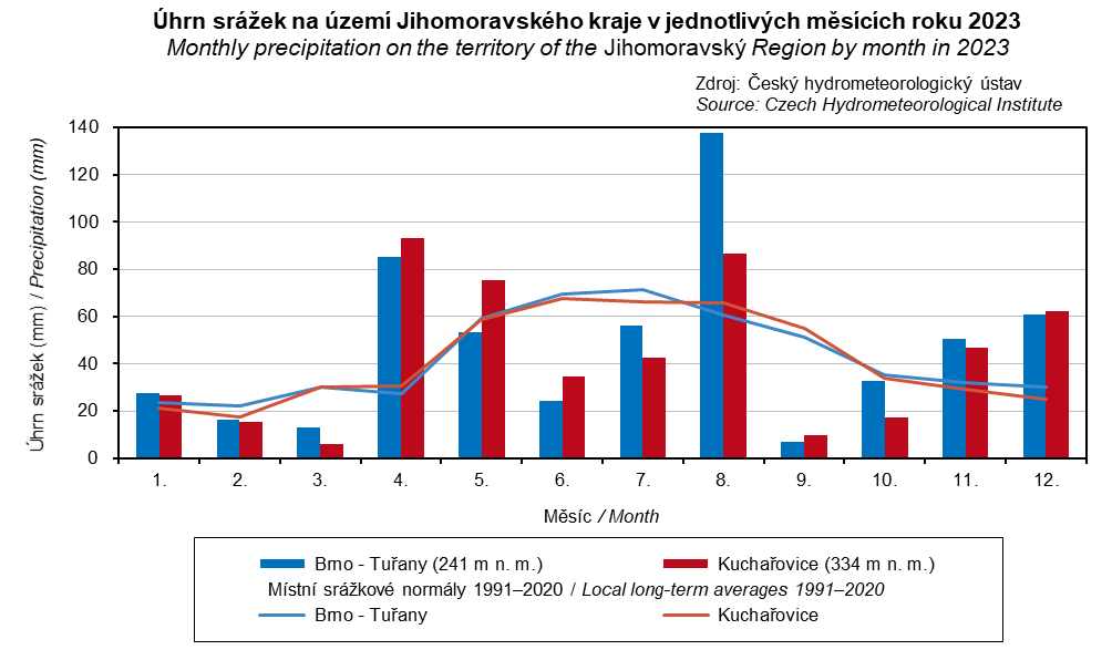 Graf 2 Úhrn srážek na území Jihomoravského kraje v jednotlivých měsících roku 2023