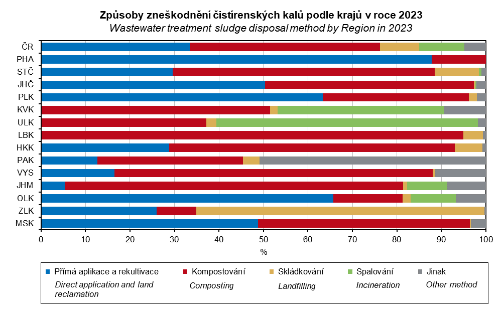 Graf 8 Způsoby zneškodnění čistírenských kalů podle krajů v roce 2023
