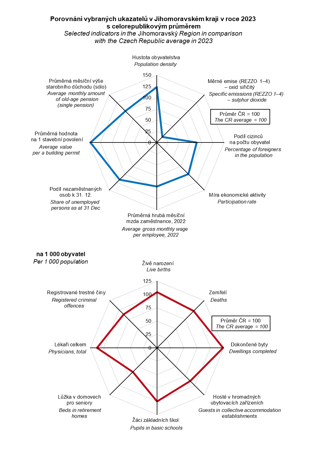 Graf 1 Porovnání vybraných ukazatelů v Jihomoravském kraji v roce 2023 s celorepublikovým průměrem