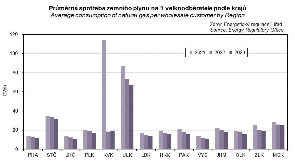 Graf 33 Průměrná spotřeba zemního plynu na 1 velkoodběratele podle krajů
