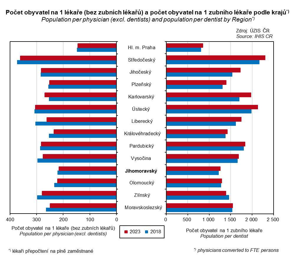 Graf 47 Počet obyvatel na 1 lékaře (bez zubních lékařů) a počet obyvatel na 1 zubního lékaře podle krajů