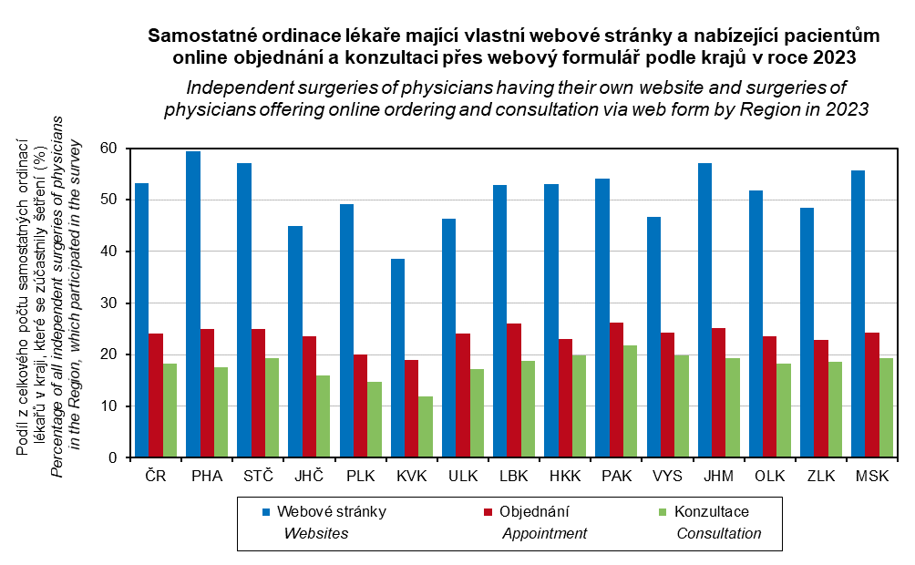 Graf 42 Samostatné ordinace lékaře mající vlastní webové stránky a nabízející pacientům online objednání a konzultaci přes webový formulář podle krajů v roce 2023