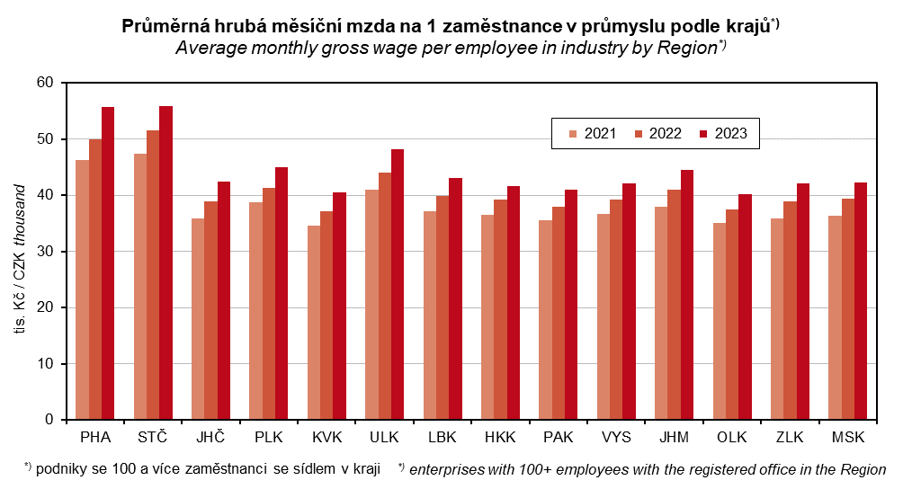 Graf 31 Průměrná hrubá měsíční mzda na 1 zaměstnance v průmyslu podle krajů