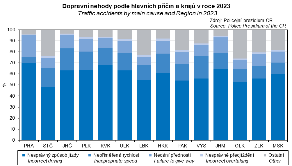 Graf 53 Dopravní nehody podle hlavních příčin a krajů v roce 2023