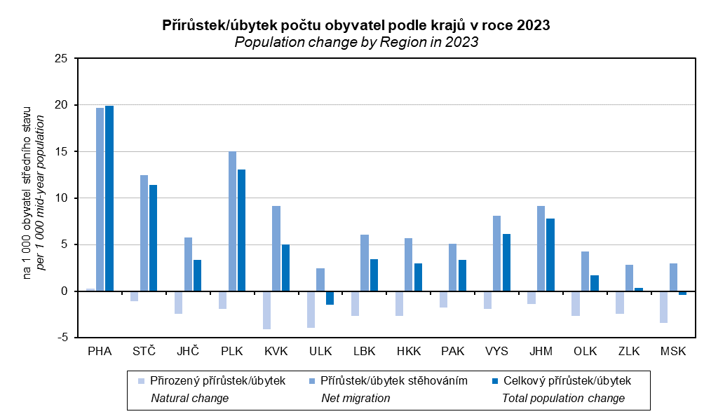 Graf 11 Přírůstek/úbytek počtu obyvatel podle krajů v roce 2023