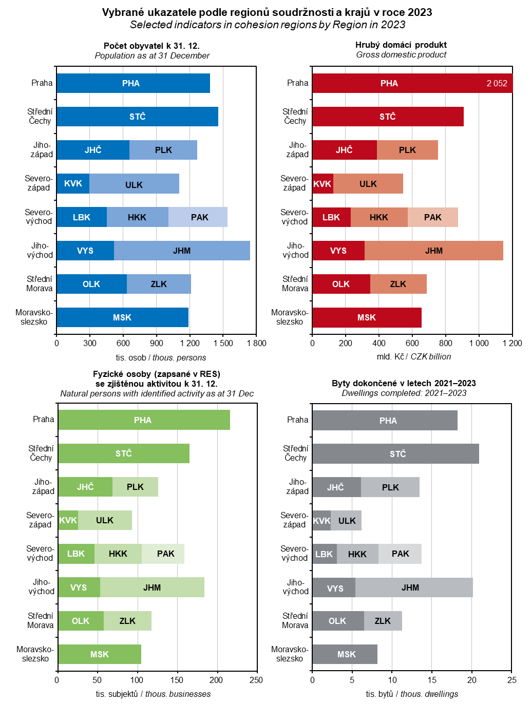 Graf 59 Vybrané ukazatele podle regionů soudržnosti a krajů v roce 2023