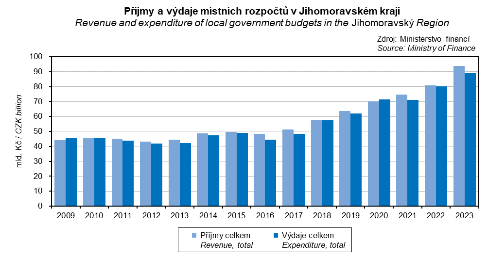 Graf 15 Příjmy a výdaje místních rozpočtů v Jihomoravském kraji