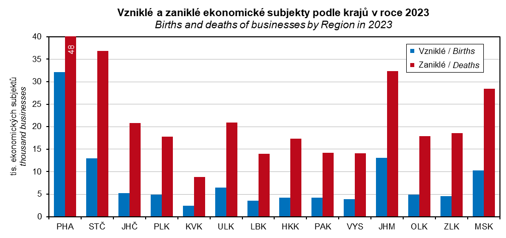 Graf 23 Vzniklé a zaniklé ekonomické subjekty podle krajů v roce 2023