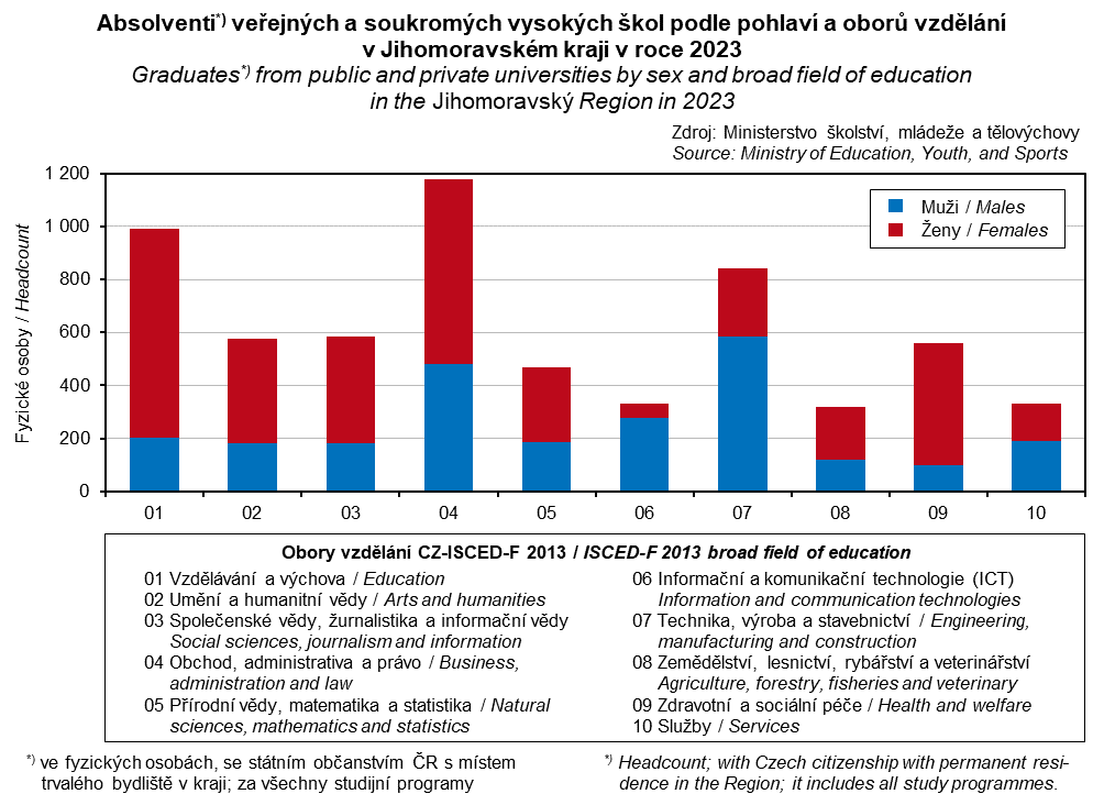 Graf 45 Absolventi veřejných a soukromých vysokých škol podle pohlaví a oborů vzdělání v Jihomoravském kraji v roce 2023
