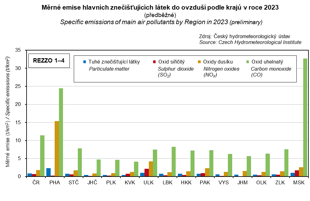 Graf 5 Měrné emise hlavních znečišťujících látek do ovzduší podle krajů v roce 2023