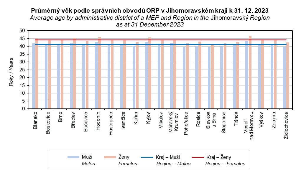 Graf 57 Průměrný věk podle správních obvodů ORP v Jihomoravském kraji k 31. 12. 2023