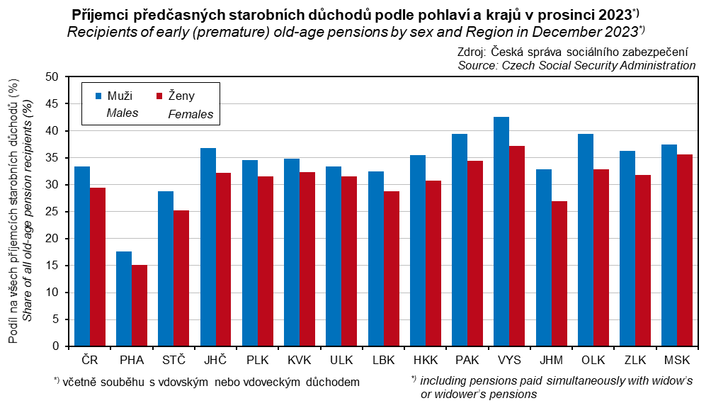 Graf 51 Příjemci předčasných starobních důchodů podle pohlaví a krajů v prosinci 2023