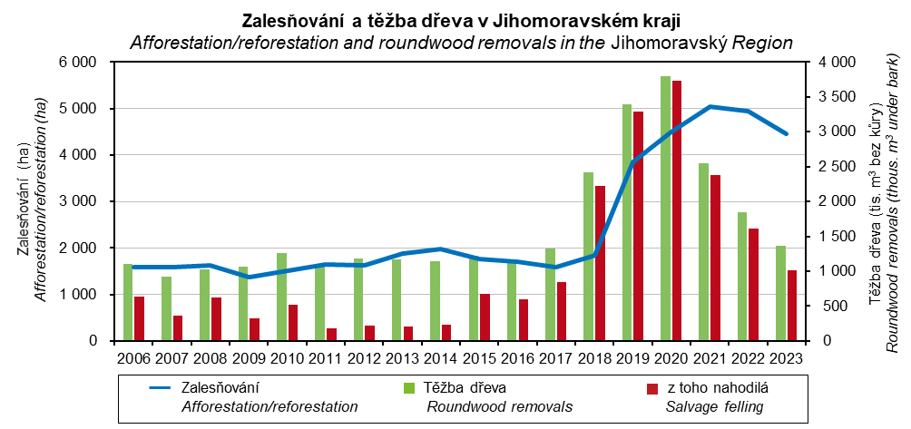 Graf 28 Zalesňování a těžba dřeva v Jihomoravském kraji