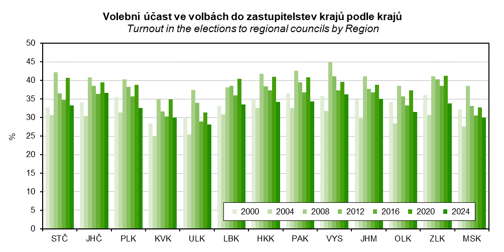 Graf 55 Volební účast ve volbách do zastupitelstev krajů podle krajů