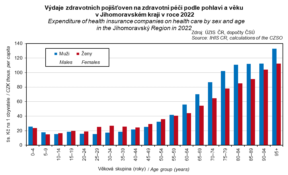 Graf 48 Výdaje zdravotních pojišťoven na zdravotní péči podle pohlaví a věku v Jihomoravském kraji v roce 2022