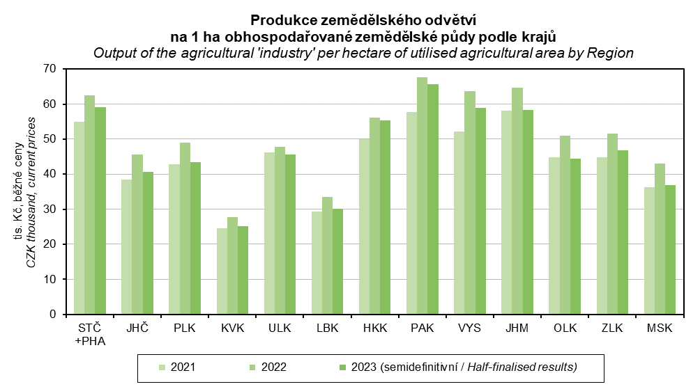 Graf 24 Produkce zemědělského odvětví na 1 ha obhospodařované zemědělské půdy podle krajů