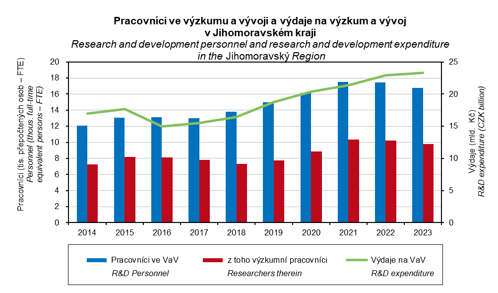 Graf 43 Pracovníci ve výzkumu a vývoji a výdaje na výzkum a vývoj v Jihomoravském kraji
