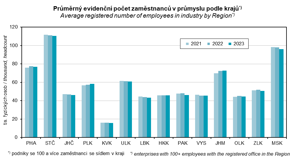 Graf 30 Průměrný evidenční počet zaměstnanců v průmyslu podle krajů