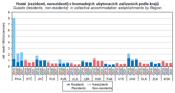 Graf 36. Hosté (rezidenti, nerezidenti) v hromadných ubytovacích zařízeních podle krajů