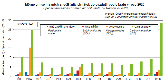 Graf 5. Měrné emise hlavních znečišťujících látek do ovzduší podle krajů v roce 2020