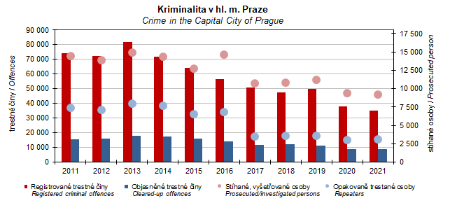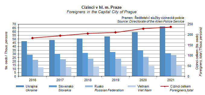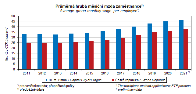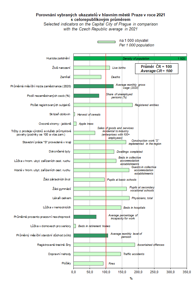 Graf 1. Porovnání vybraných ukazatelů v hl. m. Praze v roce 2021 s celorepublikovým průměrem