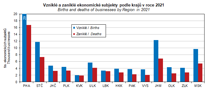 Graf 22. Vzniklé a zaniklé ekonomické subjekty podle krajů v roce 2021