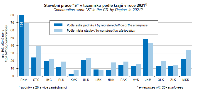 Graf 33. Stavební práce "S" v tuzemsku podle krajů v roce 2021