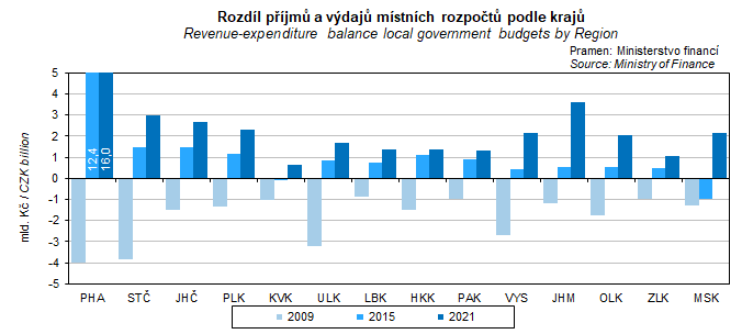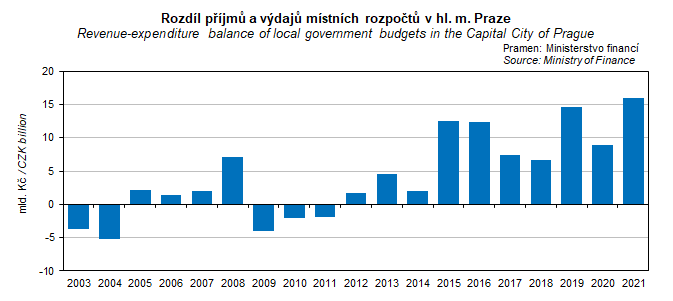 Graf 16. Rozdíl příjmů a výdajů místních rozpočtů v hl. m. Praze