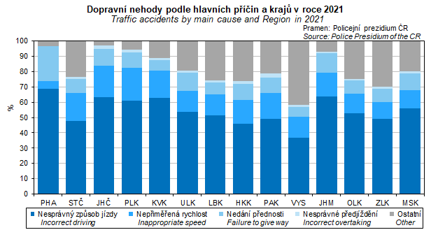Graf 46. Dopravní nehody podle hlavních příčin a krajů v roce 2021