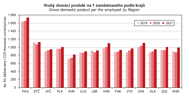 Graf 13. Hrubý domácí produkt na 1 zaměstnaného podle krajů