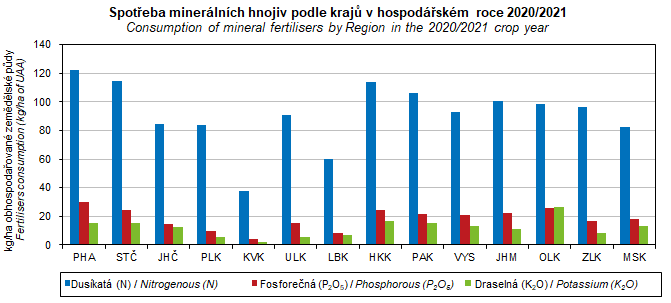 Graf 27. Spotřeba minerálních hnojiv podle krajů v hospodářském roce 2020/2021