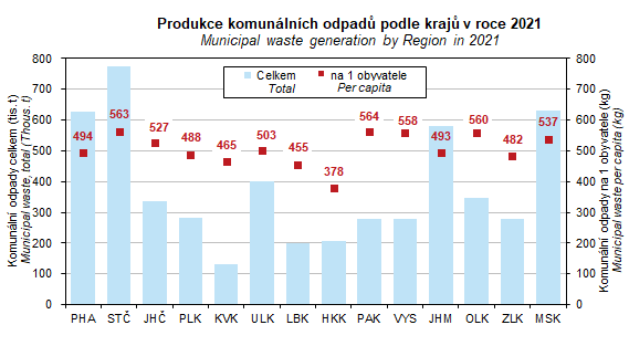 Graf 6. Produkce komunálních odpadů podle krajů v roce 2021