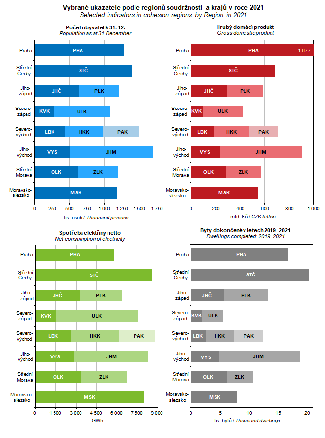 Graf 52. Vybrané ukazatele podle regionů soudržnosti a krajů v roce 2021