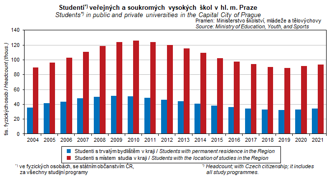 Graf 39. Studenti veřejných a soukromých vysokých škol v hl. m. Praze