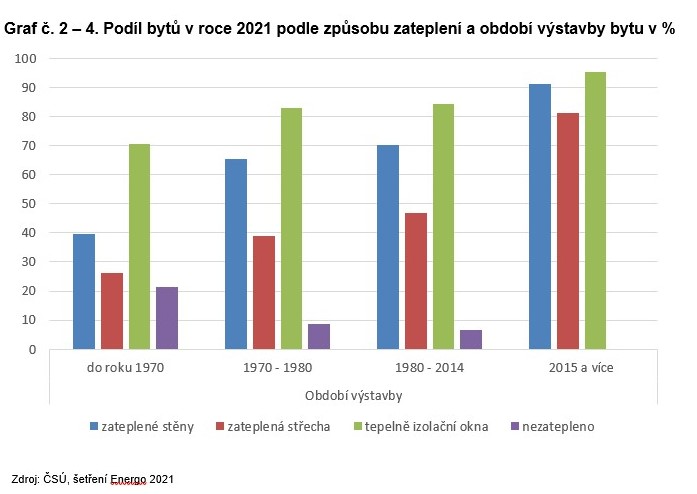 Graf č. 2 – 4. Podíl bytů v roce 2021 podle způsobu zateplení a období výstavby bytu v %