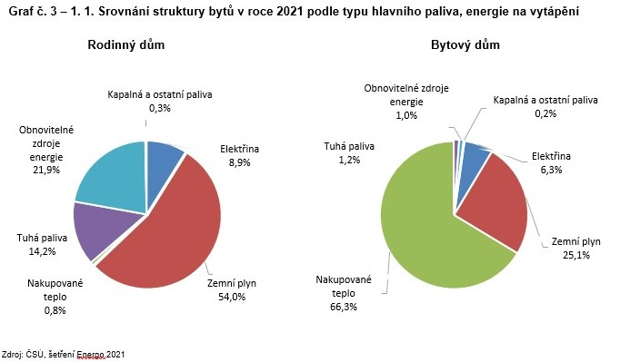 Graf č. 3 – 1. 1. Srovnání struktury bytů v roce 2021 podle typu hlavního paliva, energie na vytápění
